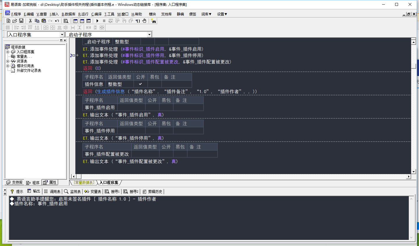 点击启用,一打开的易语言的状态栏输出“事件_插件启用”