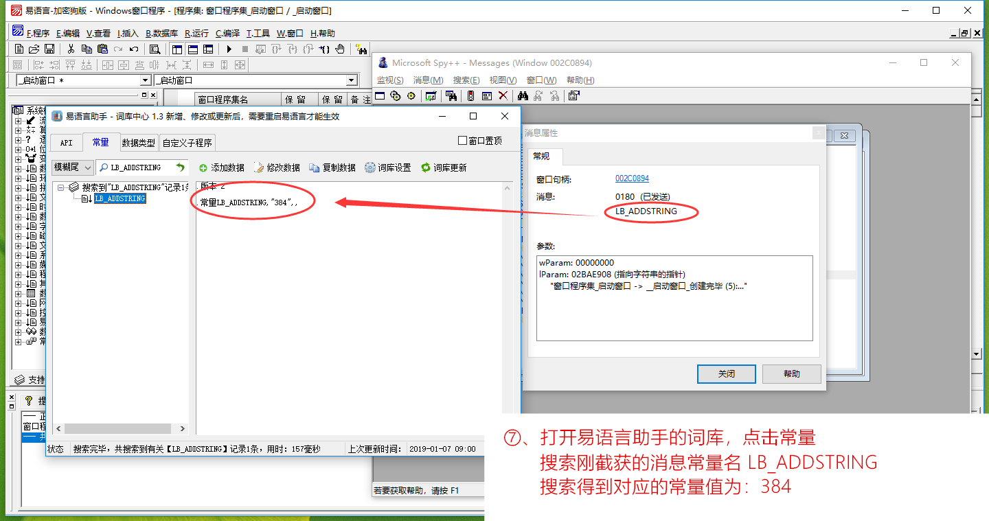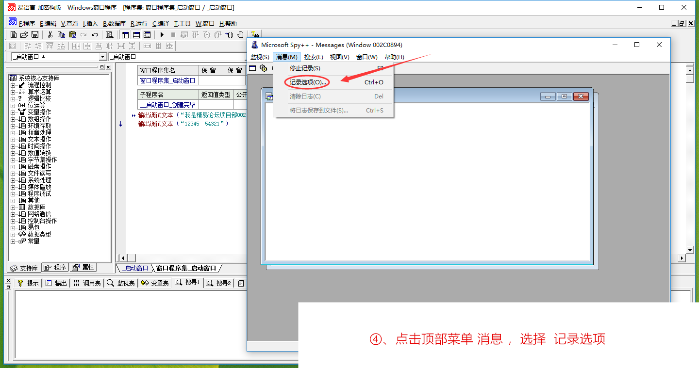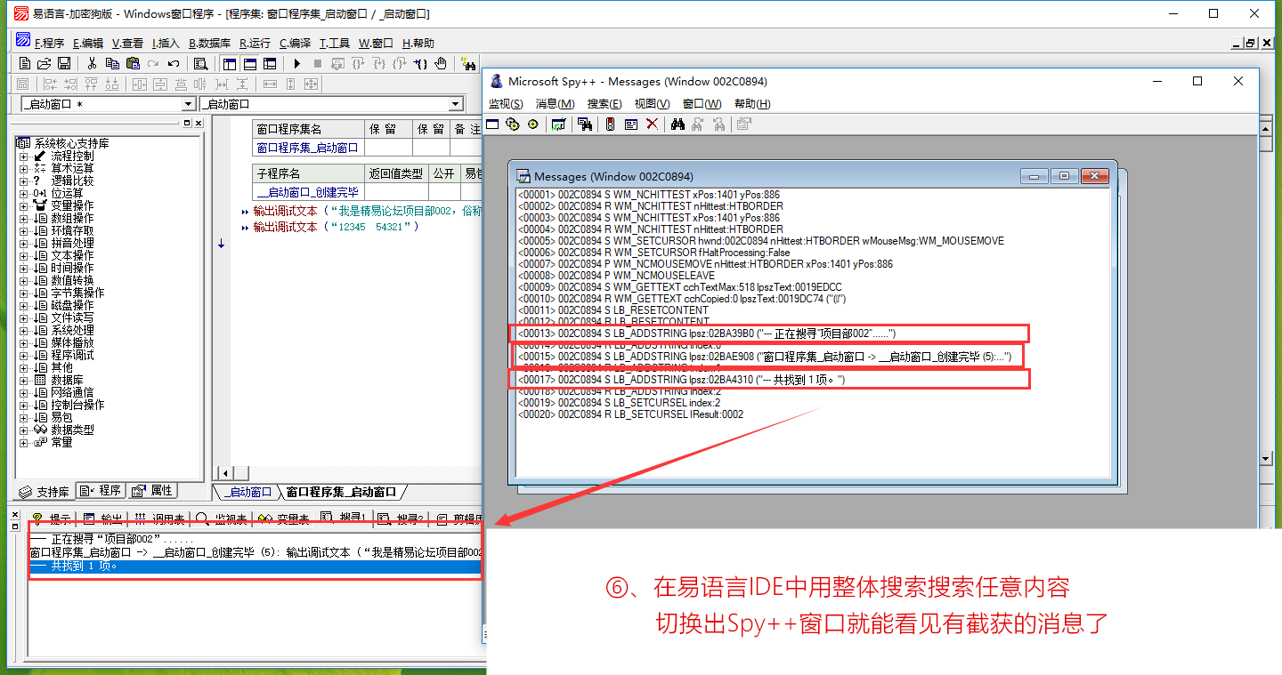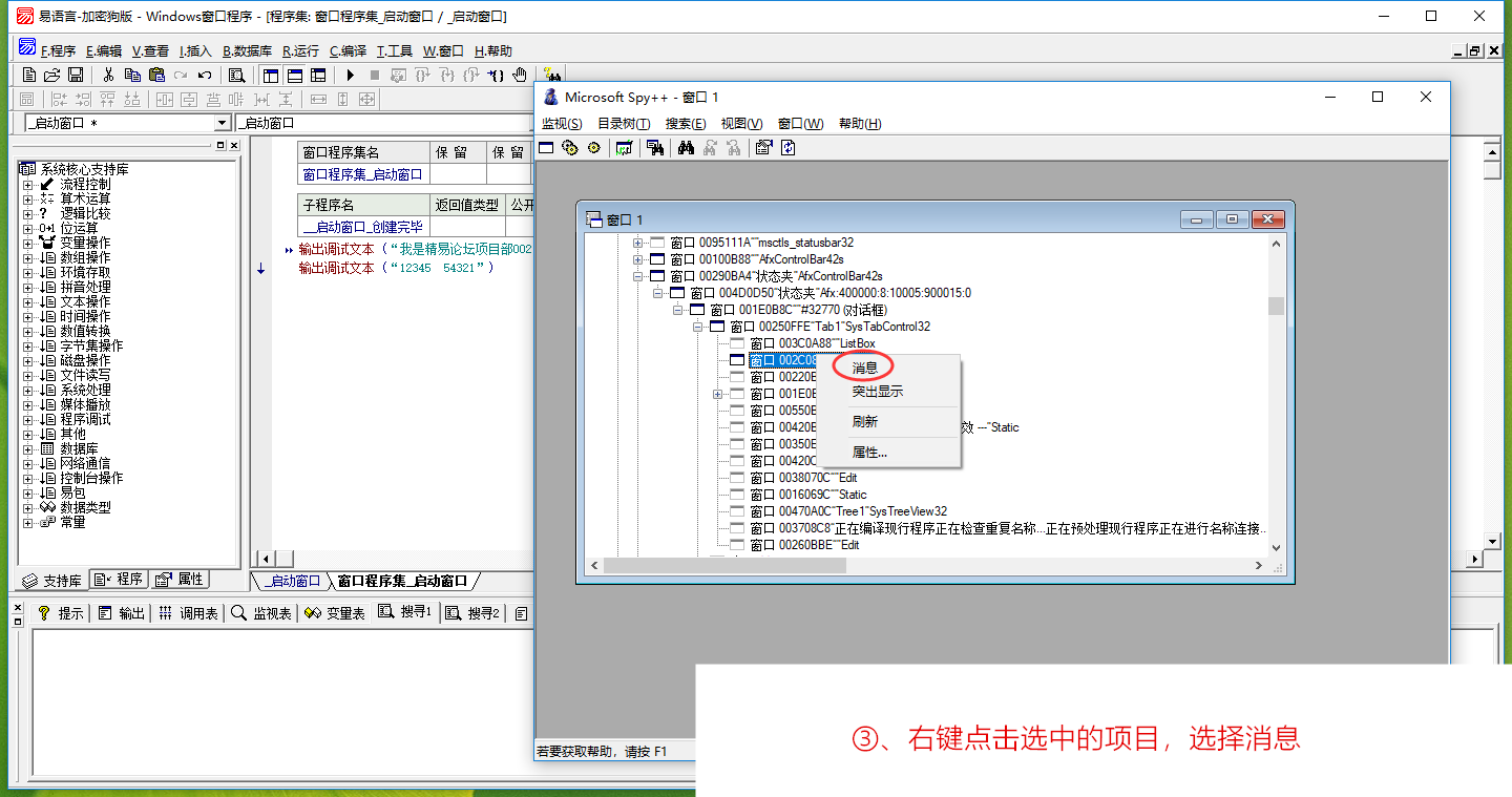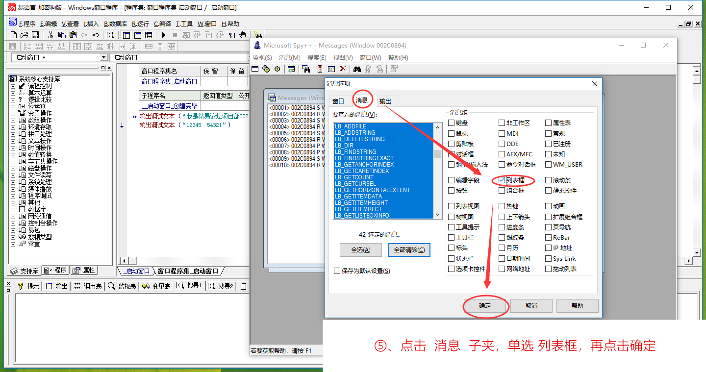经过以上操作,我们已经完成了对易语言IDE控件搜寻1的列表框的消息截获了。其他控件也是类似操作,不同的只是在用工具截获的时候选择的消息类型,如果不确定是什么控件,可全选。